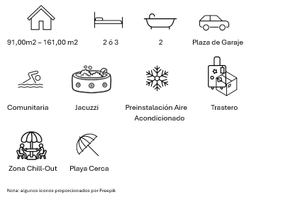 Apartamentos de obra nueva a tan solo 300 metros de la playa. La urbanización consta de un total de 36 viviendas de 2 y 3 dormitorios con 2 baños con climatización, aparcamiento y trastero. Todas las zonas comunes van a estar ubicadas en el solárium, un lugar ideal para disfrutar del mejor amanecer o atardecer gracias a sus vistas 360º, una piscina infinity con 3 camas de agua, jacuzzi y zona chill-out. Todas las viviendas contarán con terraza o jardín privado, en el caso de las de planta baja, en los cuales se podrá construir piscina privada. Uno de los puntos a destacar del residencial es su excelente orientación, ya que vas a poder elegir entre apartamentos con orientación Noreste o Suroeste. Desde 310.000€